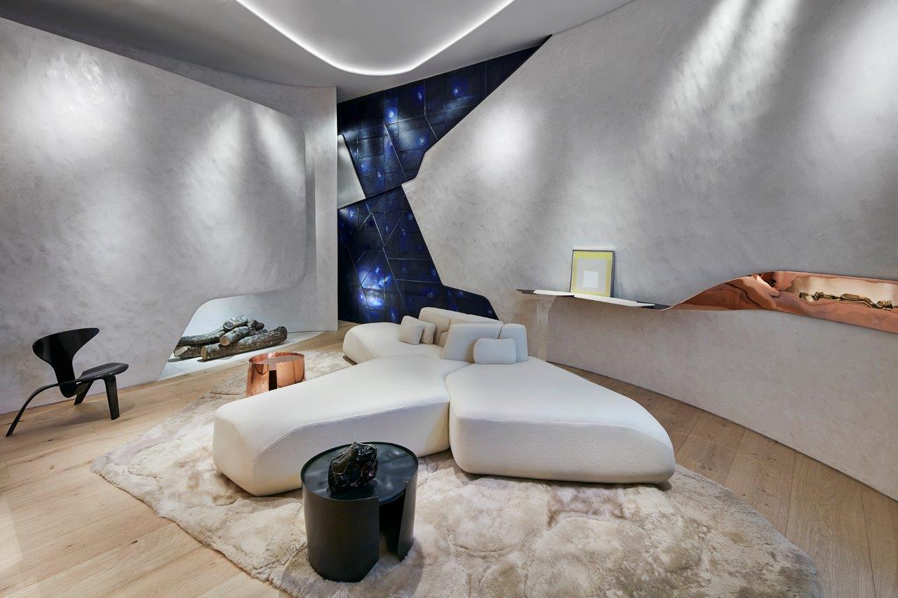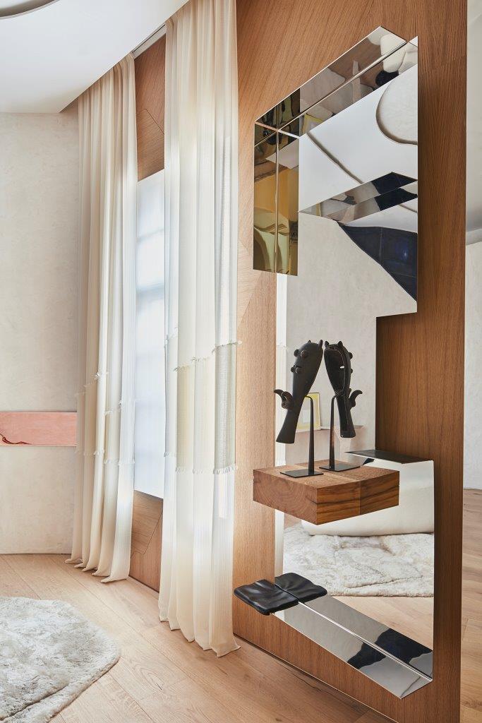 Fabrication et installation des habillages muraux, des bibliothèques et de la consoles en chêne naturel, inox poli miroir, cuivre poli et travertin.