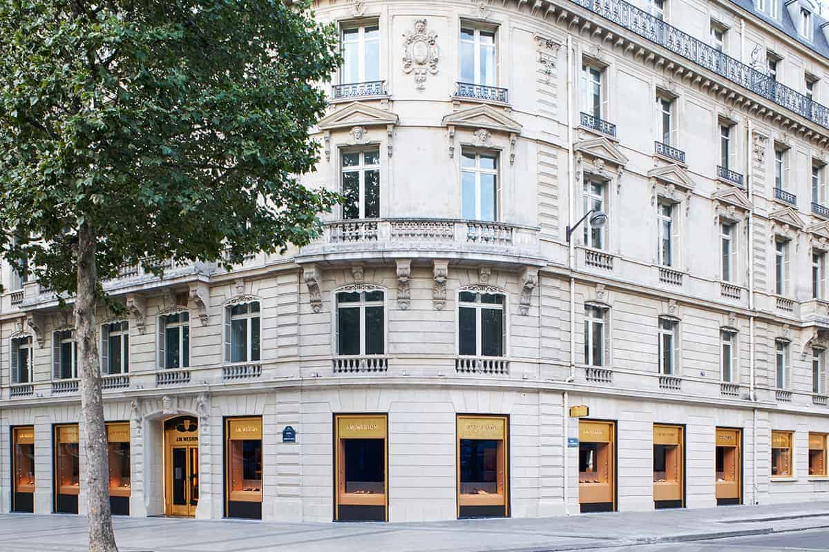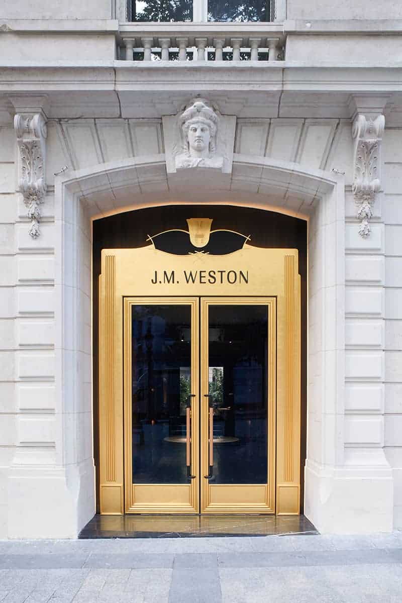 Conception, fabrication et pose de la façade en bronze, aluminium doré et verres sécurisés du magasin J.M. Weston des Champs Elysées